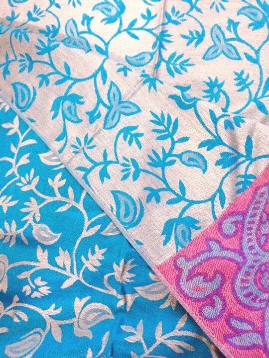 爽やかなブルーが素敵なパシュミナ100%、大判ストールです。
