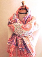真冬もあったかい、厚地の大判ストールです。 華やかな織模様がエキゾチック。 暖色系なので、顔周りが明るい印象になります☆ カジュアルスタイル、フォーマル、意外と着物にも合います。 70cm×166cm パシュミナ100%